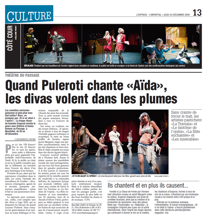 Cette comédie musicale propose de découvrir les coulisses d’un opéra de façon humoristique et décalée. À travers des personnages hauts en couleur tels que Luciano Pulerotti, Carotina ou Nathalie Dessert, le public assiste à une représentation (presque) de Aïda… si tout va bien ! Fantaisiste, énergique et accessible, ce spectacle initiatique autour de l’opéra est une invitation à rire tout en découvrant les codes du genre lyrique.